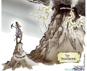 Obama, recordemos, fue elegido con el voto esperanzado del 52% de los estadounidenses y, como es habitual, esa popularidad escaló aun más en el momento de su asunción.