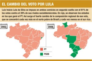 Luiz Inácio Lula da Silva ganó las elecciones de 2002 y 2006 de modo casi calcado: en ambas debió esperar a la segunda vuelta, derrotó a sendos candidatos del Partido de la Social Democracia Brasileña (PSDB), los dos paulistas, y obtuvo un 61% de los votos. Sin embargo, estos datos ocultan la profunda transformación que sufrió en el período el voto por el Partido de los Trabajadores, que pasó de tener su núcleo en los suburbios obreros del sur industrial de Brasil a concentrarse abrumadoramente en el norte pobre. Las imágenes que acompañan esta nota son reveladoras: en la primera de esas contiendas el lulismo ganó en casi todo el país, pero en la segunda debió compensar la pérdida del sur con votaciones épicas en el norte.
