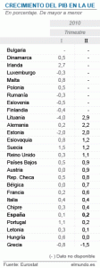 Según los datos oficiales correspondientes al segundo trimestre (ver gráfico), Alemania (50% de cuya economía depende de las exportaciones) sorprendió con un crecimiento del 2,2%, el mayor desde la reunificación en 1990. Mientras, recortes del gasto mediante, el resto de la eurozona navega en entre la intrascendencia, el estancamiento y la catástrofe, con el “crecimiento” francés del 0,6%, el español del 0,2% y el retroceso griego del 1,5%.