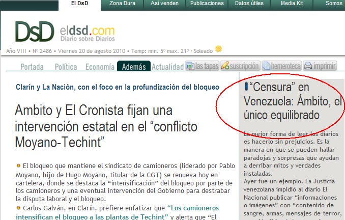 Aprecio mucho el comentario publicado por ese sitio de la nota que publiqué en Ámbito Financiero y en este blog sobre el último capítulo de la pelea entre el gobierno de Venezuela y la prensa privada de ese país. Sobre todo porque da cuenta de un esfuerzo por analizar los temas con honestidad intelectual, más allá de errores que se puedan cometer. Espero que no se tome como un elogio interesado que diga ahora que me alegra que el elogio provenga de un sitio como el mencionado, cuya cobertura de la prensa gráfica es habitualmente excelente. Gracias otra vez.