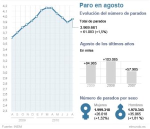 Así las cosas, no sorprende que el desempleo se mantenga en julio en un 10% promedio, su máximo nivel en doce años. Nada menos que 16 millones de trabajadores. Y que la situación laboral sea sencillamente dramática en los países más afectados por la crisis. Para no caer en el efectismo más fácil, no vayamos al extremo de Grecia; hablemos de España, el país más cercano a nosotros en la zona del euro.