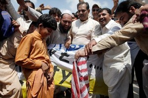 (Un niño paquistaní orina una bandera estadounidense en Punjab. Foto de la agencia Reuters).