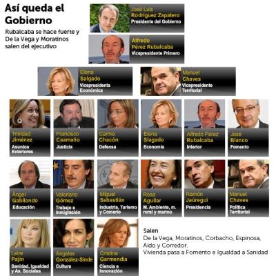 La profunda remodelación de gabinete decidida por José Luis Rodríguez Zapatero incluyó algunos movimientos de importancia, destinados a sortear el reclamo opositor de elecciones anticipadas (algo posible tras la aprobación del Presupuesto con apoyo de partidos regionales) y asegurarse la supervivencia política hasta los comicios de 2012. Al menos eso, en momentos en que las encuestas arrojan una ventaja de dos dígitos largos a favor del conservador Partido Popular, una rareza en un sistema político como el español caracterizado por una estable división casi por mitades del electorado.