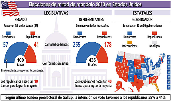 Las elecciones de mitad de mandato (legislativas y gobernaciones) suelen ser un trago amargo para los gobiernos en Estados Unidos. No es esta la excepción, ya que Barack Obama llega sin ninguna posibilidad de triunfo, con una intención de voto a nivel nacional once puntos menor a la de sus rivales. Es más, se descuenta a esta hora que los republicanos desalojarán a los demócratas de la mayoría en la Cámara de Representantes (que renueva la totalidad de sus 435 miembros) y acortarán su desventaja en el Senado (para el que se votan 37 de un total de 100). Asimismo, los opositores avanzarían en varias de 37 gobernaciones que cambiarán de titular (sobre 50 a nivel nacional). El espectro de una parálisis legislativa, en tal escenario, es fuerte.