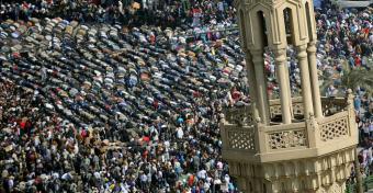 La foto (difundida por la agencia EFE) no es sólo estéticamenet atractiva; es una postal del Egipto que viene. En ella foto se ve una multitud abigarrada que hoy coincide en exigir la salida del poder del dictador Hosni Mubarak. Pero si se mira más atentamente, se la ve dividida. A la derecha, al pie del minarete de una mezquita, miles se hincan para rezar; a la izquierda, otros tantos los miran de pie.