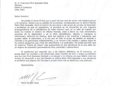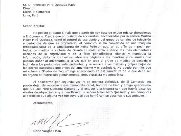 El premio Nobel denunció a través de una carta que ese medio se ha convertido en una “máquina propagandística» a favor de la candidata conservadora Keiko Fujimori y que su interés en vedar el camino del nacionalista Ollanta Humala al poder lo ha llevado a violar “a diario las más elementales nociones de la objetividad y de la ética periodísticas».