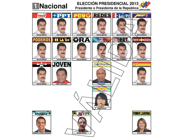Llama la atención que en la boleta Nicolás Maduro aparezca muchas más veces que Henrique Capriles, pero no hay trampa allí. Ocurre que Maduro va como candidato de cada uno de los partidos que lo apoyan, lo mismo que había pasado en octubre con Capriles, que aparecía muchas más veces. ¿Raro, perfectible, innecesario? Puede ser, pero no es trampa-