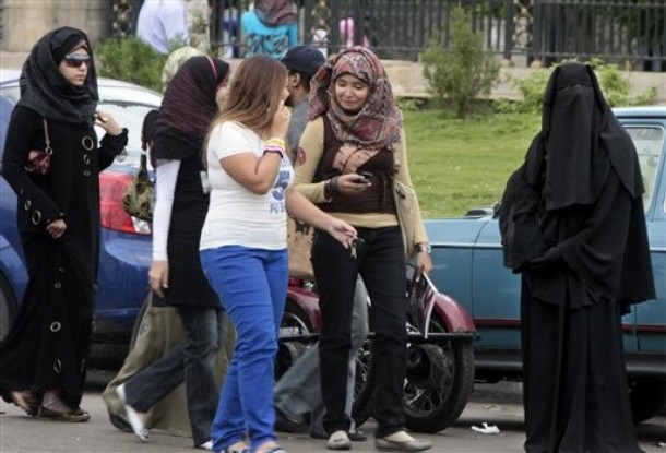 This Oct. 29, 2009 photo shows an Egyptian woman in Cairo, right, wearing the niqab, which covers everything but the eyes. Egypt's secular-leaning government, backed by a leading cleric, has banned the niqab in college dormitories and some professions, stirring fierce debate in the Arab world's most populous country. (AP Photo/Amr Nabil) (AP Photo/Amr Nabil)
