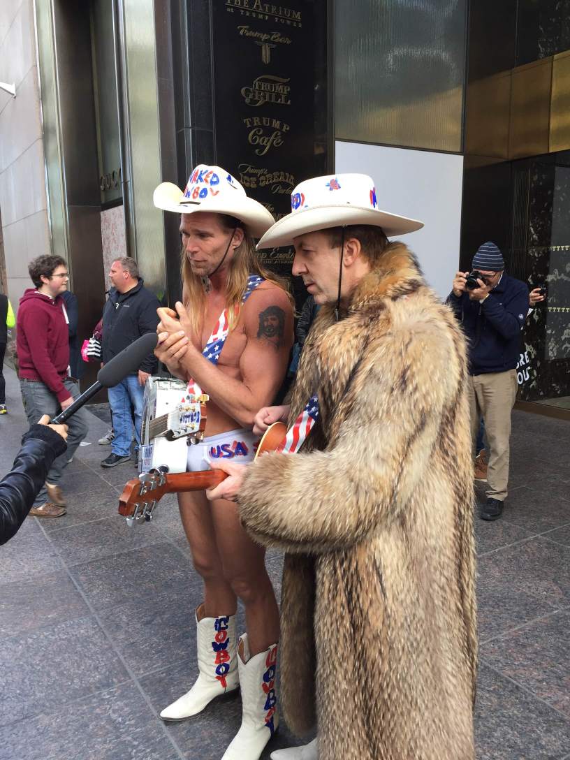 Yendo hacia el este y bajando por la Quinta avenida, muy cerca de ese tramo del maratón, también se juntaba gente, incomparablemente menos verdad. Apenas unas decenas de personas, en general turistas y un par de periodistas como este enviado de ámbito.com, observaban una curiosa escena en la puerta de la Trump Tower. Dos hombres extraños, un rubio en calzoncillos y sombrero de cowboy cantaba temas folk en clave trumpista con otro, cubierto con un tapado de piel.