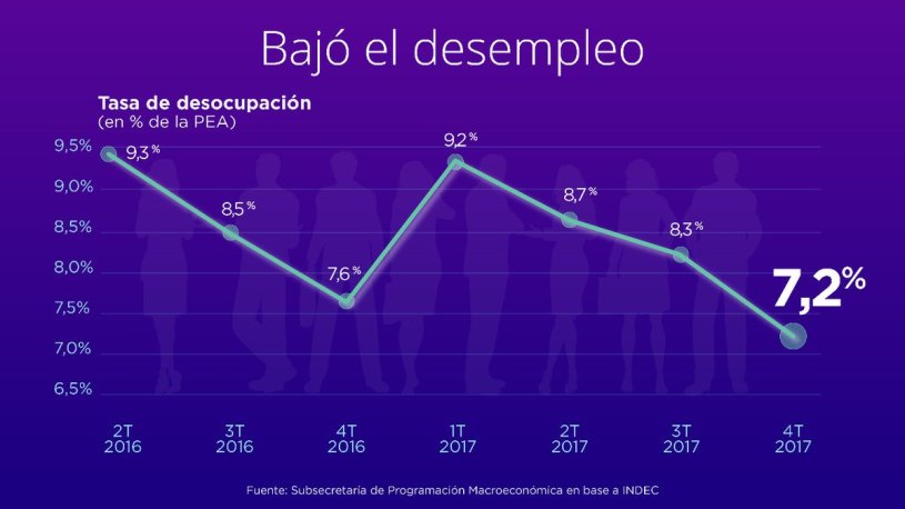 “Más allá de lo que el Gobierno quiera presentar, hay muy poco de positivo. En el contexto de un año como 2017, en el que se registró una recuperación de la actividad económica, se crearon 666.500 puestos de trabajo, pero en realidad la desocupación solo bajó en 14.800 personas. La tasa de desempleo se redujo de 7,6% a 7,2%, lo que no resulta relevante. El grueso del empleo generado prácticamente sirvió nada más que para absorber a la población que se había refugiado en la inactividad como producto del desaliento frente a la recesión que se vivió hasta el primer semestre de 2017”, dijo.