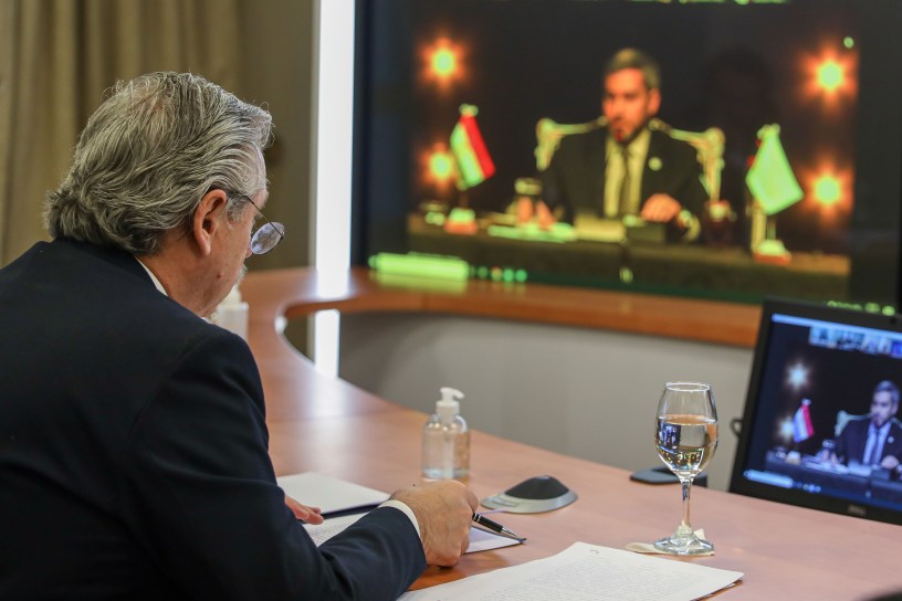 Por primera vez a través de una videoconferencia debido a las restricciones propias de la pandemia, los presidentes de los países miembros del Mercosur y de sus Estados asociados participaron este jueves en la 56a. cumbre del bloque. En la misma quedó expuesta la idea del presidente argentino, Alberto Fernández, de que el contexto global impone cautela a la hora de definir una apertura comercial, pero también su soledad frente a homólogos que militan invariablemente en el centroderecha y la derecha del espectro ideológico.
