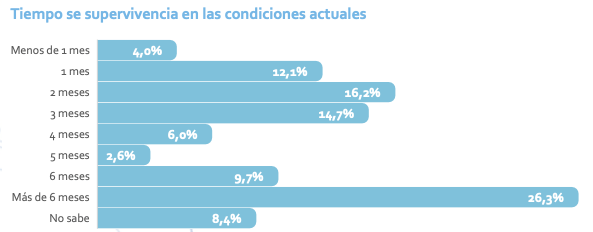 La coyuntura descripta por el trabajo es crítica: en la actual coyuntura, “el 47% de las empresas relevadas considera que no podrá sobrevivir más de tres meses y, de estas, hay un 4% que cree podrá sobrevivir menos de un mes. El 18,2% considera que podrá sobrevivir entre 3 y 6 meses, mientras que el 26,3% cree que podría sobrevivir más de 6 meses”.