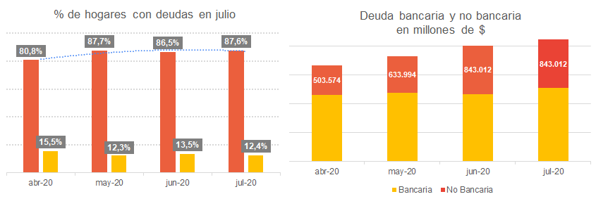 “La deuda familiar tuvo un fuerte salto en julio por la continuidad de la pandemia y el agravamiento de la situación económica para muchas familias, a pesar de relajarse la cuarentena. Por un lado, la deuda no bancaria creció 33% en el mes, empujada por mayor acumulación de compromisos sin pagar y más hogares debiendo después de una leve reducción en junio. Pero también creció 10% la deuda bancaria”, dijo.