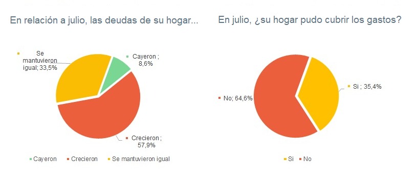 En lo que respecta a la primera, “lo más frecuente en julio continuaron siendo los atrasos de impuestos, que acumularon deudas por $227.735 millones, 23,1% más que en junio. Las familias continuaron dejando de pagar impuestos como el inmobiliario, patentes y otros nacionales y municipales”. Con todo, la otra gran deuda que se acumuló es de servicios: el stock total alcanzó los $173.193 millones, 4,9% más que en junio, con una deuda promedio de $19.505 por familia (…) Cayó 13,2% la cantidad de hogares que van normalizando esa situación, especialmente en cable, Internet y celulares”, añadió. Por último, “las deudas con familiares y amigos, por $146.044 millones, crecieron 23,9% en el mes, no tanto por el mayor stock adeudado sino porque aumentó 15,9% la cantidad de hogares con ese tipo de deudas: en julio 2,9 millones de hogares mantenían esos pasivos por un monto promedio de $50.200 pesos promedio cada uno”.