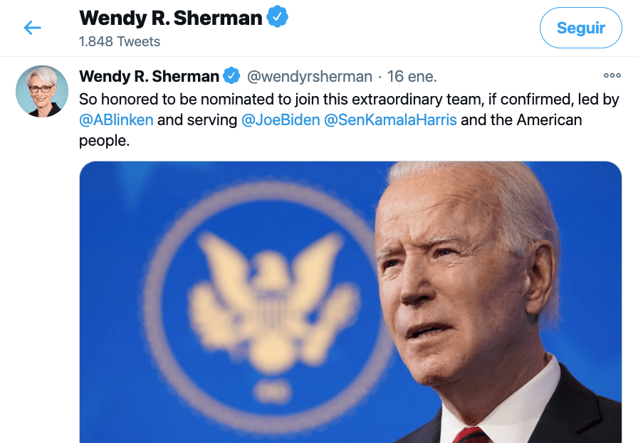 Por debajo de él, y en contacto directo con la región, estará Wendy Sherman, confirmada el último sábado como subsecretaria de Estado para Asuntos Hemisféricos. Otra obamista y clintoniana, que sacó patente de pragmática y moderada como negociadora jefa de su país en el proceso que llevó al acuerdo nuclear de 2015 con Irán.