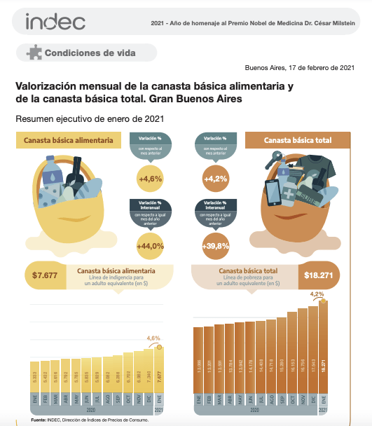 El Índice de Precios al Consumidor (IPC) de 2020 subió 36,1%, mientras que el rubro Alimentos y Bebidas No Alcohólicas lo hizo en 42,1%. El mes pasado, ambos indicadores fueron, respectivamente, del 4% y del 4,8%. En tanto, de difusión más reciente, la CBA –que considera el costo mínimo que debe asumir un adulto de 30 a 60 años para alimentarse– impuso en enero un piso de $7.677 para que un individuo no sea indigente, cifra que se eleva a $23.722 para una familia de cuatro integrantes.