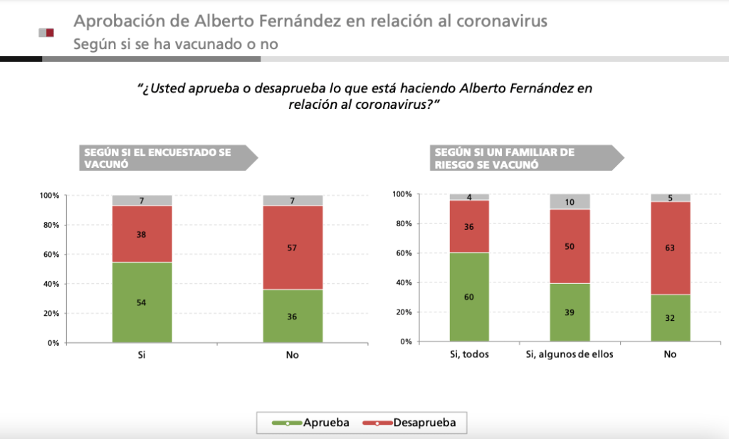 Un estudio de Poliarquía Consultores realizado antes del anuncio (1.784 entrevistas telefónicas en centros urbanos de más de 10.000 habitantes, realizada entre el 8 y el 12 de abril, con un nivel de confianza del 95%) señaló un dato sugestivo: el nivel de aprobación a la gestión del presidente Alberto Fernández parece directamente proporcional a la cantidad de argentinos y argentinas que ya recibieron al menos una dosis de las vacunas disponibles.
