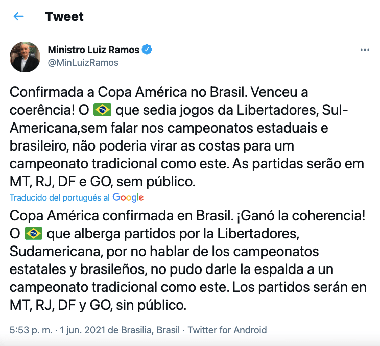 «La noticia es que tenemos cuatro estados que se ofrecieron voluntariamente para que la Copa América se realice en Brasil después de que Argentina no quiso hacerla. El primer partido será el domingo 13, acá, en Brasilia», proclamó, triunfante el martes a la noche. El torneo no tendrá público en las canchas.