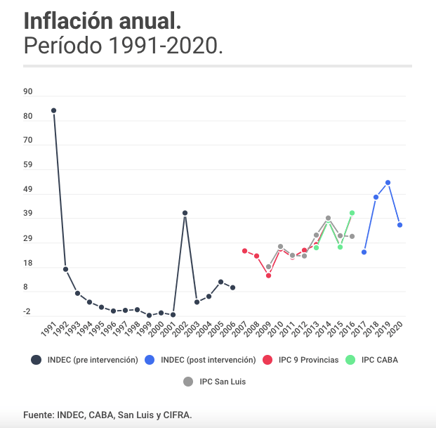 En el camino, tanto los ministros de Economía Macri –Alfonso Prat-Gay, Luis Caputo, Nicolás Dujovne y quien llegó simplemente para evitar el colapso total, Hernán Lacunza– como Martín Guzmán no dejaron de imaginar que la inflación bajaría, siempre sin éxito. Lo que Cristina había dejado en un entorno nunca blanqueado de entre el 25 y el 30%, en 2016 saltó, merced a la devaluación de Prat-Gay, a 40,6%, bajó en 2017 –ya con un INDEC en regla– a 24,8%, se disparó en 2018 a 47,6% finalizó en 2019 a toda orquesta en 53,8%.
