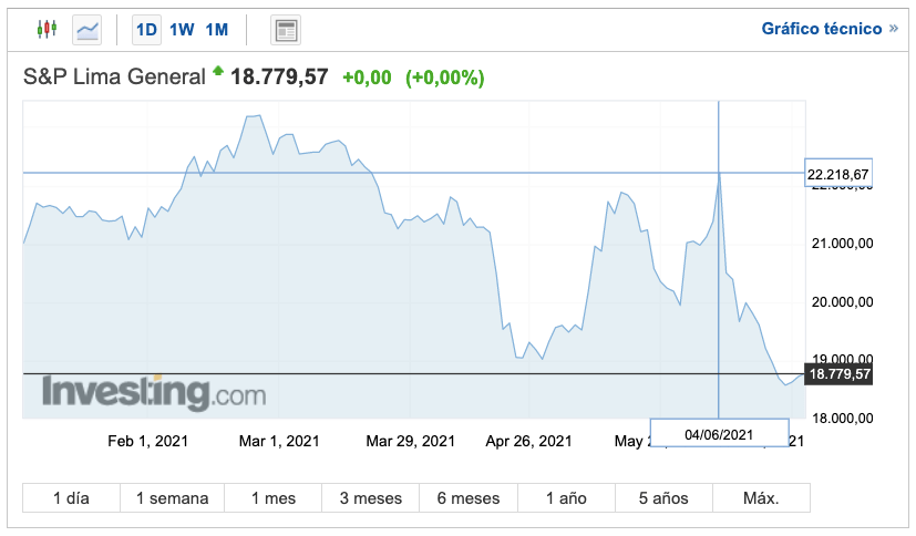 El índice general de la Bolsa de Lima se desplomó 15,47% entre el viernes previo a la apertura de las urnas y el miércoles último.