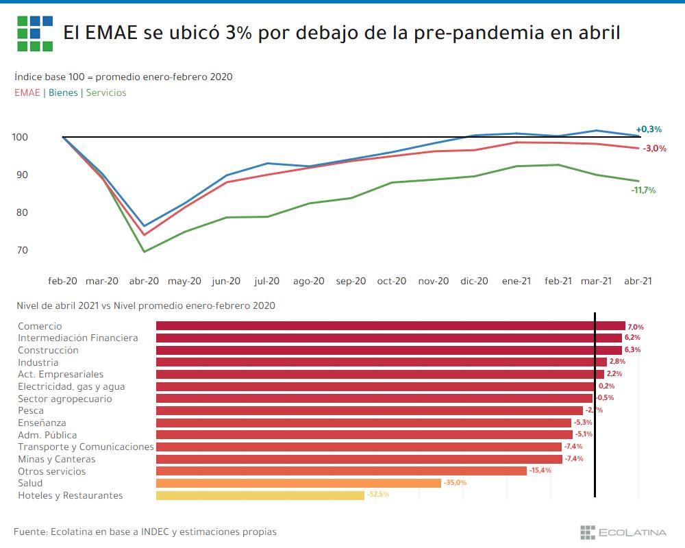 “La actividad avanzó solo 0,5% en el primer cuatrimestre de 2021 –y todo concentrado en enero–. De esta manera, se verifica cómo el crecimiento de este año será más efecto de arrastre estadístico (+6%) que una mejora genuina, explicada por un buen desempeño económico”, agregó.