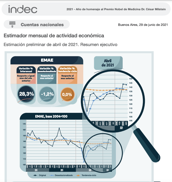 Justamente en la comparación interanual, dicho índice saltó 28,3%, efecto de la bajísima base que dejó el mismo mes del año pasado, cuando el confinamiento contra el covid-19 se expresó en un derrumbe de la actividad del 26,4%.