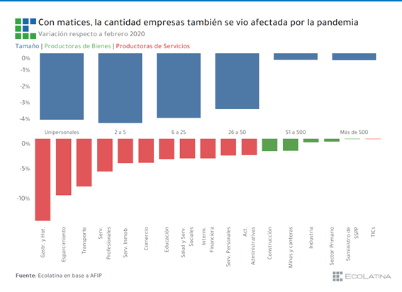 La destrucción de unidades productivas se agravó en la pandemia, pero no se ha limitado a ella. Siempre según Ecolatina, «entre 2003 y 2011, la cantidad de empresas del sector privado formal saltó 60%, ayudada principalmente por una economía pujante. Entre 2012 y 2018, el estancamiento del PBI tuvo en su correlato en la cantidad de firmas, que permaneció sin variación. Finalmente, entre 2018 y 2019 cerraron cerca de 18.000 empresas netas (-3,9%)».