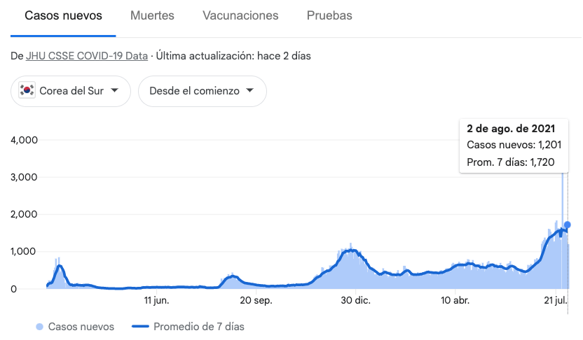 En tanto, en Corea del Sur el domingo se registraron 1.201 contagios frente a apenas 23 de un año antes.
