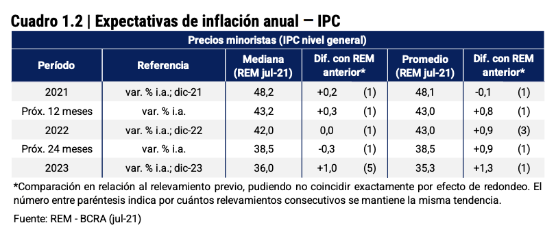 Lejos de ser un pronóstico aislado, ese es el consenso de los analistas. De acuerdo con el Relevamiento de Expectativas de Mercado (REM) de julio, la inflación anual se proyecta en un promedio del 48,2%, que se eleva al 48,5% si solo se toman en cuenta las respuestas de los mejores pronosticadores de ese ítem. En tanto, para el año próximo se anticipan una de 42% y, si todo sale bien, 36% para 2023.