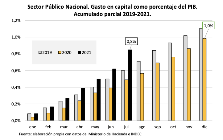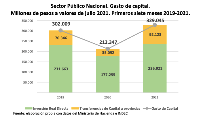 «Estas cifras se ubican 55% por encima de lo observado en igual lapso de 2020, mientras que sus principales componentes, la IRD y Transferencias a provincias crecieron en un 34% y 163%, respectivamente. La comparación contra 2019 muestra que el gasto de capital acumulado en 2021 resulta superior al de aquel año en un 9%. La inversión directa es un 2,5% superior a la de 2019 y las transferencias a provincias son un 31% real más altas que hace 2 años», continúa.