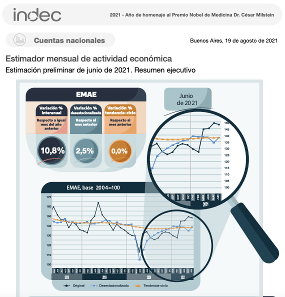 El Estimador Mensual de la Actividad Económica (EMAE, anticipo de los datos oficiales de PBI) creció 10,8% interanual en junio, pero se ubica todavía 2,1% por debajo del mismo mes de 2019.