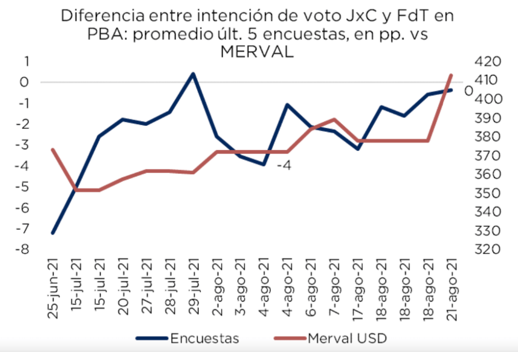 En todo caso, el trading electoral influye en el corto plazo. «Lo que estamos viendo hoy es que el mercado está tradeando encuestas, no un resultado electoral. Esta interpretación adquiere verosimilitud cuando se observa la dinámica en las encuestas en las últimas semanas, en las que consistentemente el oficialismo viene perdiendo terreno».