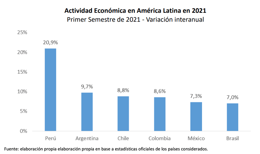 Un estudio del Instituto Argentino de Análisis Fiscal (IARAF) indicó que «para este año, el FMI proyecta un crecimiento en la región de 5,8% y de 3,2% para 2022. El organismo advierte que la recuperación mundial puede darse a dos ritmos, dependiendo del grado de acceso a las vacunas que tienen los países. Los datos disponibles son consistentes con estas proyecciones. Al considerar el primer semestre 2021, se aprecia que la mayor recuperación tiene lugar en Perú (20,9%), seguida por Argentina (9,7%) y Chile (8,8%)».