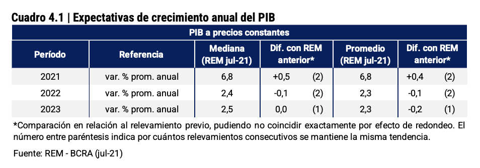 El Relevamiento de Expectativas de Mercado (REM, la encuesta que realiza cada mes el Banco Central entre economistas de referencia) arrojó en su última edición una mejora de la perspectiva de crecimiento, que pasó del 6,3% al 6,8%. En tanto, el Fondo Monetario Internacional (FMI) incrementó en julio su pronóstico para el país del 5,8% anterior al 6,4% y Moody’s Analytics hizo lo propio hasta el 6,6%.