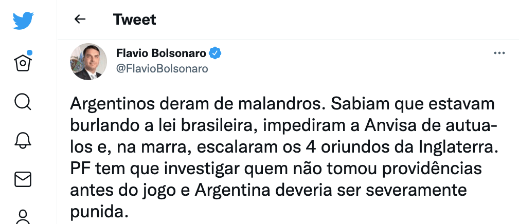 Iniciado el partido, la discutida Anvisa decidió, finalmente, actuar y forzar la suspensión; ahí la política metió la cola y el gobierno de Bolsonaro buscó mostrarse enérgico, algo útil en el contexto mencionado. Así, el hijo senador del presidente, Flavio Bolsonaro, salió en Twitter a denunciar las «picardías» de los argentinos. Un poco de chauvinismo, de exhibición de dureza y de juego para la tribuna nunca vienen mal.