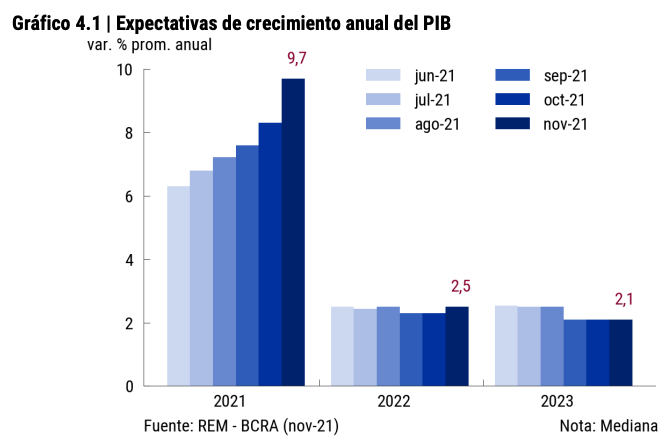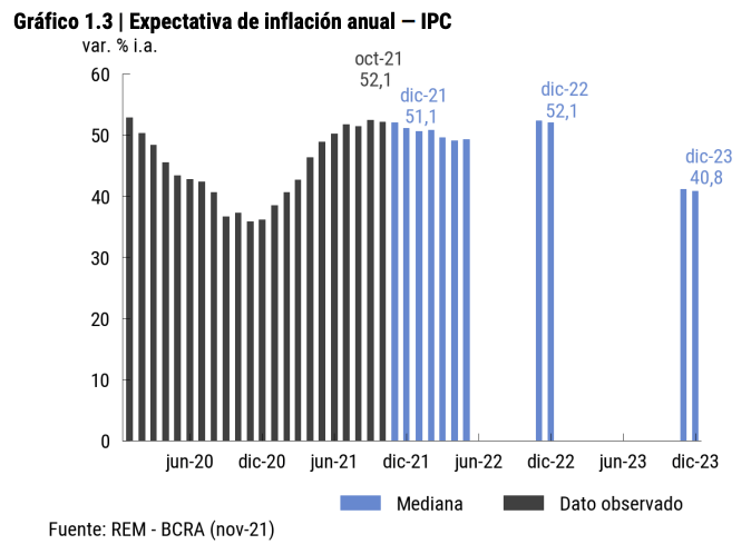 De acuerdo con el REM de noviembre, el último difundido por el Central, el consenso del mercado delinea un 2022 con un crecimiento mediocre –2,5%–, una inflación similar a la del año pasado –52,1%–, la persistencia de un cepo cambiario duro y una suba del dólar oficial hasta $ 161 en diciembre próximo, en línea con el incremento de los precios al consumidor.