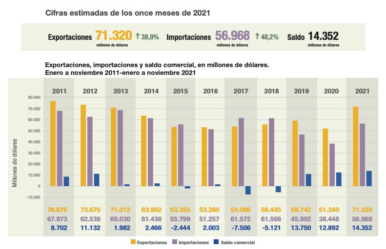 De acuerdo con las cifras oficiales más recientes del comercio exterior, correspondientes a noviembre, las exportaciones de los primeros once meses del año ascendieron a 71.320 millones de dólares, nada menos que 38,9% por encima del 2020 del Gran Confinamiento por la pandemia y de la semiparalización del tráfico mundial de productos y servicios.