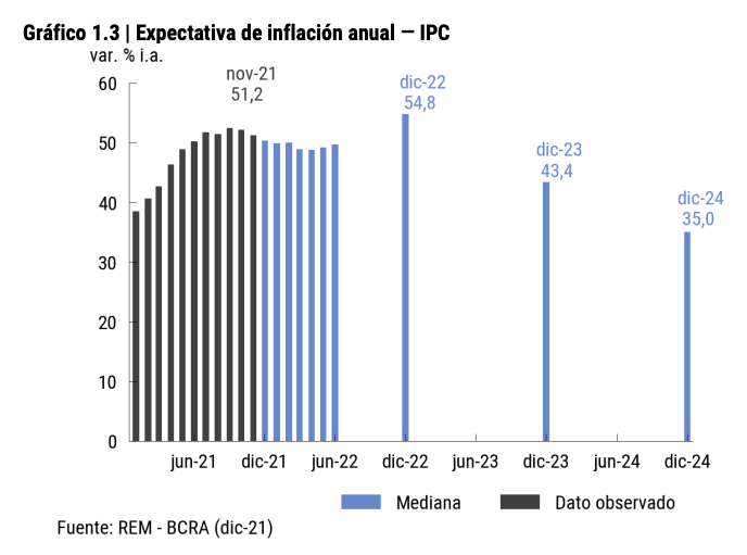De acuerdo con el Relevamiento de Expectativas de Mercado (REM) de diciembre –la encuesta que realiza cada mes el Banco Central entre los principales especialistas del sector privado–, «la inflación minorista de 2022 se ubicaría en 54,8%», esto es 2,7 puntos porcentuales por encima de las proyecciones del mes anterior. Las expectativas se deterioran.