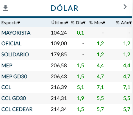 En efecto, los dólares arbitrados en bolsa –legales– han subido en lo que va del año entre tres y seis veces más que el oficial –sobre todo en las últimas ruedas–, mientras que el ilegal blue cerró el miércoles a un récord nominal histórico de 212 pesos.