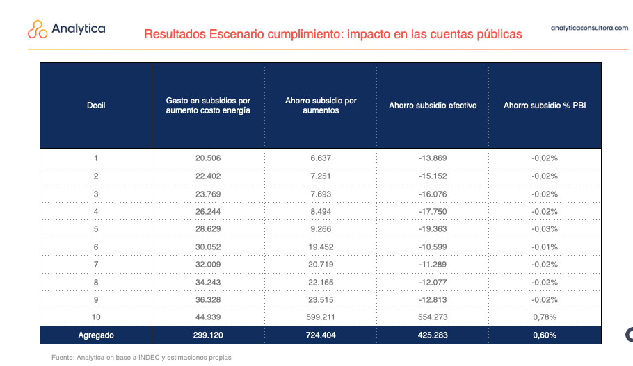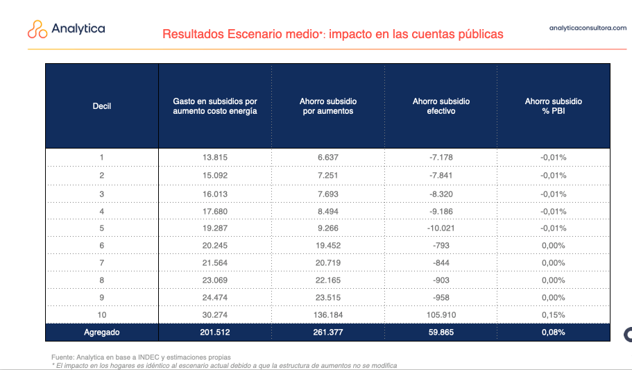 Tanto el Fondo como el Gobierno dicen que el efecto total de la segmentación permitirá realizar un ahorro fiscal de 0,6% del PBI. La misma, cabe recordar, quitará todo el subsidio al 10% de ricos y clase media más acomodada y, como proporción de la evolución de los salarios, incrementará en 42% las facturas del sector intermedio y en 21% las de los beneficiarios de la tarifa social.