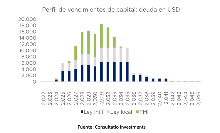 En tercer lugar, el salto que experimentarán desde 2024 los vencimientos de deuda que surge de las renegociaciones con los tenedores privados y con el FMI hace que «si bien no se puede descartar que el próximo gobierno logré bajar drásticamente el riesgo país, de manera de posibilitar el acceso a los mercados, la fallida experiencia de los inversores internacionales con el cambio político de 2015 lo tornará difícil. Vemos como el escenario más probable una nueva reestructuración con acreedores privados durante el próximo mandato presidencial», señala Consultatio.