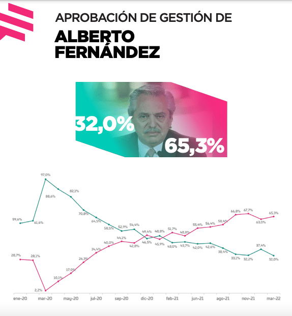 Los y las fieles afirman que el mandatario se ve candidato en 2023. “¿Qué otro dirigente peronista tiene 40 puntos de imagen positiva?”, desafían. Es un misterio qué encuestas ven en la Casa Rosada. Si hay que guiarse por las que se conocen, como la última de Zuban, Córdoba y Asociados (nacional, 1.300 casos, con cuestionario estructurado on line y un margen de error de +/– 2,71 puntos porcentuales), la ponderación del jefe de Estado luce hoy bastante por debajo de semejante guarismo.