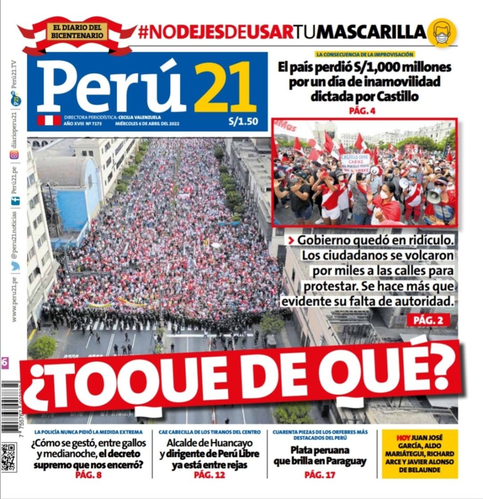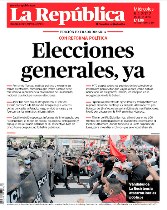 «Desatinos del presidente Pedro Castillo abren camino a nuevas elecciones», tituló, por su parte, La República, que consideró que el Gobierno atraviesa una «fase terminal».
