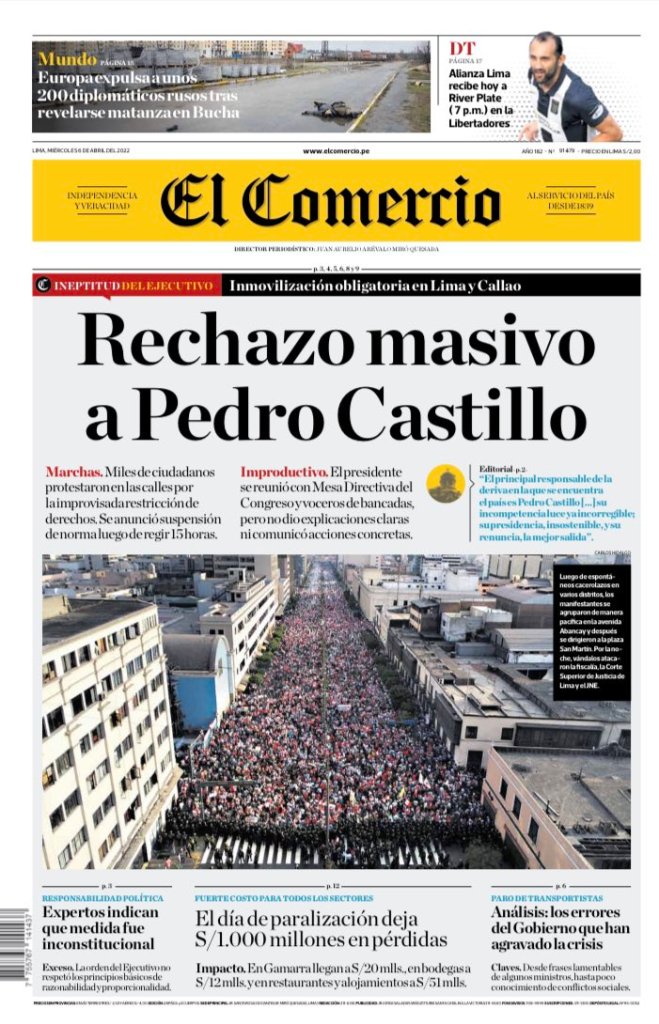 «Presidencia insostenible. Los hechos de ayer confirmaron que lo mejor para el país sigue siendo que el presidente Pedro Castillo dé un paso al costado», dijo este miércoles en su editorial el diario más tradicional del país, El Comercio.