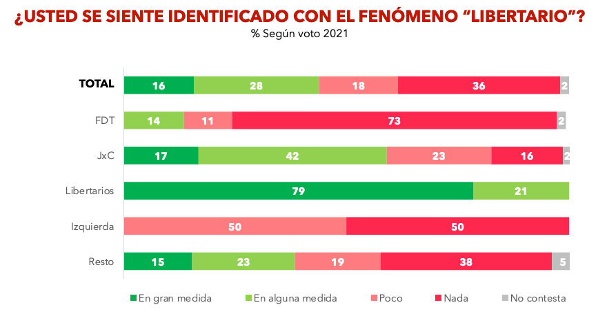 Según la encuesta de abril de D’Alessio Irol, el minarquista Javier Milei, rostro más visible del «fenómeno libertario», «consolida su liderazgo». El estudio (medición nacional online, realizada en abril en base a 270 entrevistas con mayores de 18 años) señala que «el 44% se identifica en alguna medida con este fenómeno», mientras que el 54% lo rechaza. El dato es que, entre la minoría creciente de los que lo miran con cariño, hay que contar «a seis de cada diez votantes de Juntos por el Cambio» (JxC).