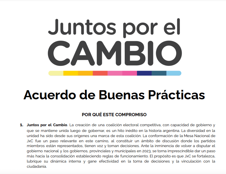 Para eso, dispone «la adopción de reglas para la Mesa Nacional de JxC», cuyas reuniones, se acordó, serán quincenales.
