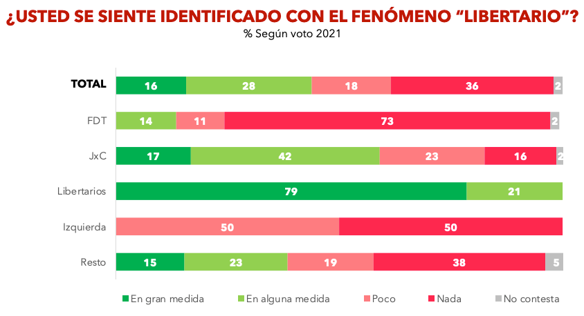 Su intención de voto crece entre quienes se definen como «libertarios» (86%; 57% seguramente lo votaría y 29% podría llegar a hacerlo) y en el nivel socioeconómico medio-alto (53%), indica. «También lo votarían 4 de cada 10 electores de JxC, aunque con seguridad, solo lo haría un 8%». Entre los votantes del Frente de Todos, el 86% no sufragaría por él.