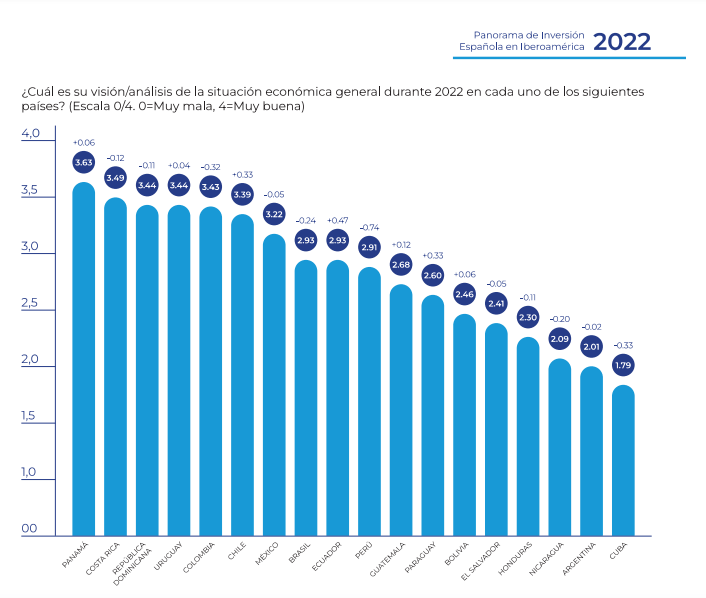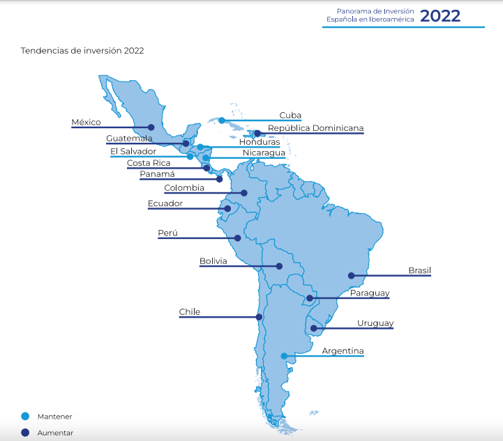 De acuerdo con la edición de 2022 del Panorama de Inversión Española en Iberoamérica, elaborado por IE University para la aerolínea Iberia, los nuevos proyectos privados se concentrarán en México, Brasil, Chile, Uruguay, Paraguay, Colombia, Perú, Ecuador, Bolivia, Panamá, Costa Rica, Guatemala, República Dominicana. Mientras, Argentina se encuentra en un lote minoritario de mercados en los que las compañías solo planean “mantener” sus intereses.