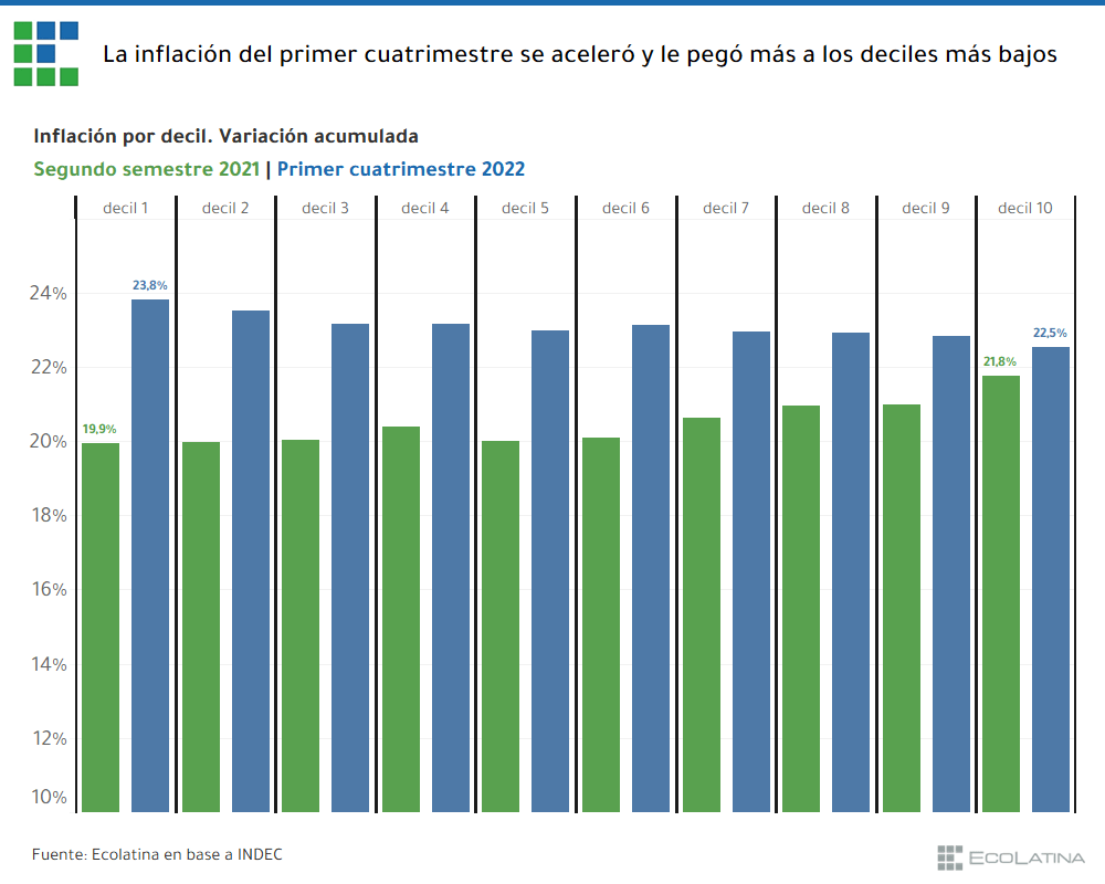 El Índice de Precios al Consumidor (IPC) del INDEC cerró abril en 6%, mientras que el acumulado del primer cuatrimestre fue del 23,1% y el de los doce meses previos, 58%. Sin embargo, explica Ecolatina, «no solo la inflación acumulada del primer cuatrimestre ya superó la de los últimos seis meses del año anterior, sino que también la del decil más pobre fue mayor a la del decil más rico en el comienzo de 2022: 2 puntos porcentuales de diferencia».
