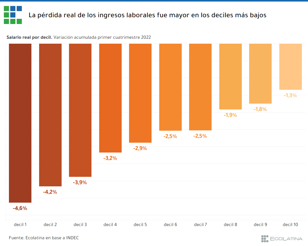 «No solo la inflación por decil se movió de manera dispar, sino que también lo hicieron los ingresos laborales. Si bien en todos los deciles existió una pérdida real del poder adquisitivo en el primer cuatrimestre, fue bastante heterogénea al interior: mientras que la caída de los ingresos laborales rondó 2% en el 50% más rico, fue de casi 4% en la mitad más pobre. Al comparar entre el decil más pobre (-4,6%) y más rico (-1,3%) la diferencia observada es aun más grande», añade.